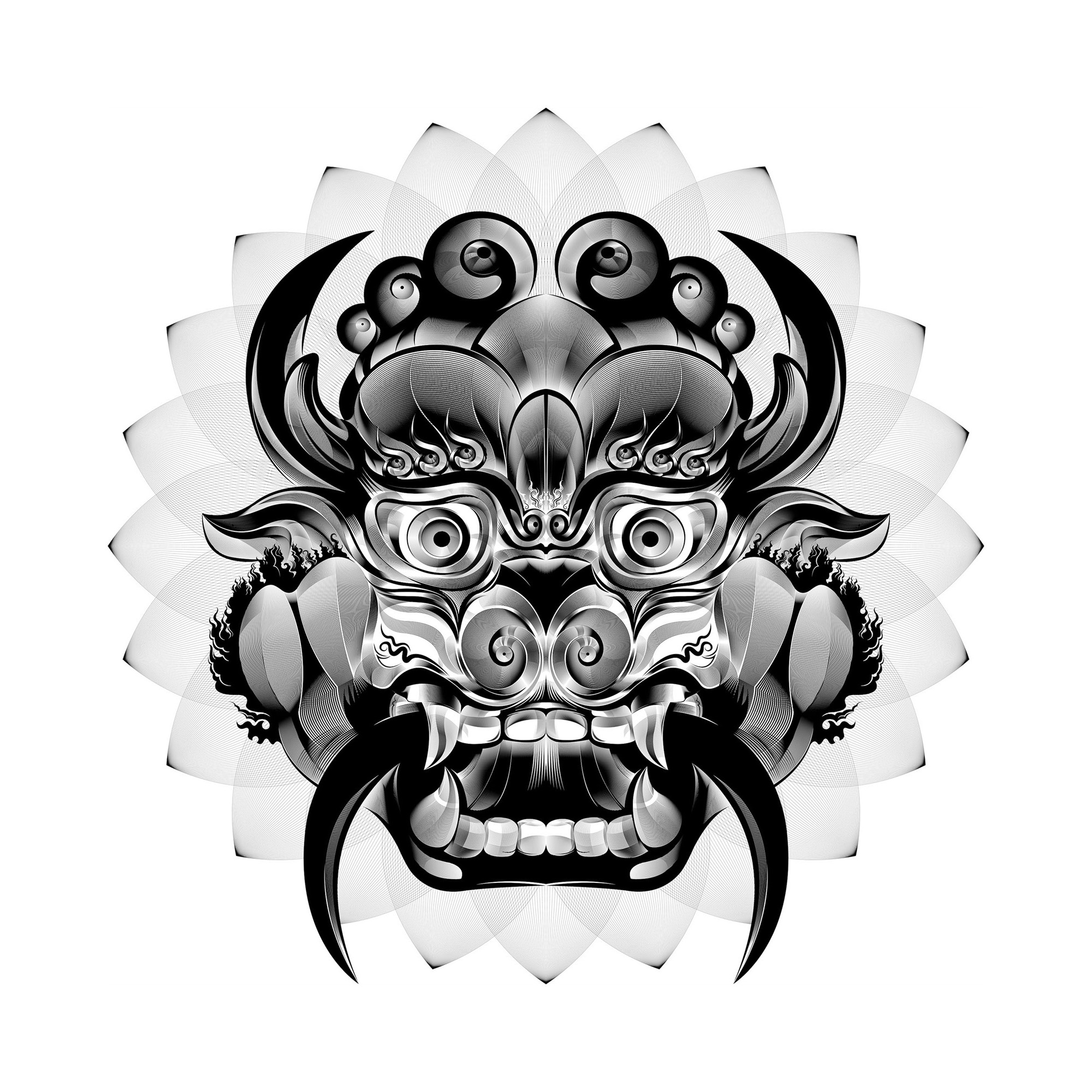 This modern interpretation preserves the essence of that fierce protection: mythic strength, unwavering vigilance, and a face meant to terrify anything with ill intent. Stylized and symmetrical, the design honors tradition while channeling it through a contemporary lens—part spiritual icon, part visual incantation.